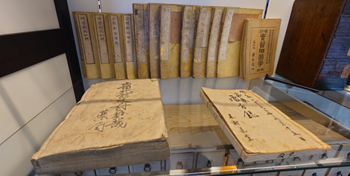 医学書(奥)・7代目の処方録(手前左)と家族の処方録(手前右)