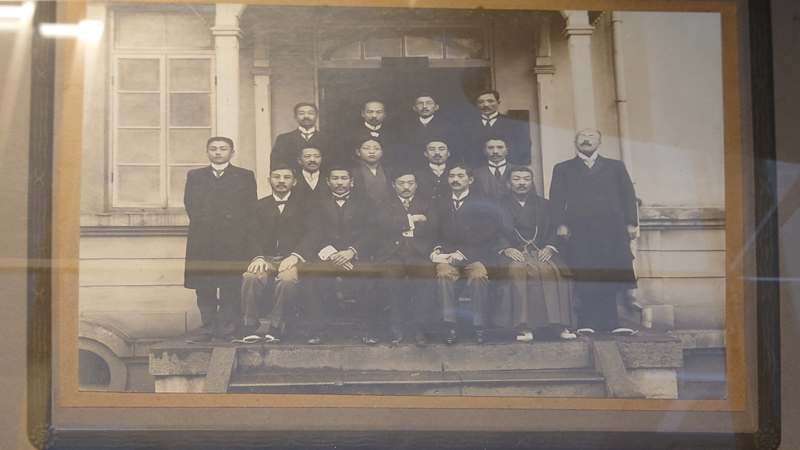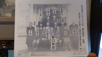 異なる時代の医療道具(手前)と野口英世が長岡に来た時に撮影された集合写真(奥)